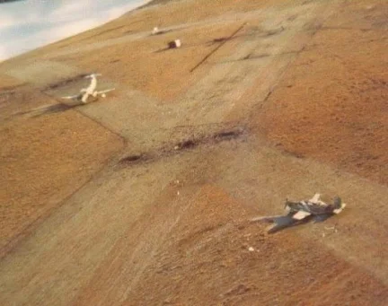 Vista aérea de la pista de la Estación Aeronaval Calderón.                         Uno de los 7 pucara destruidos en la Isla Borbón.