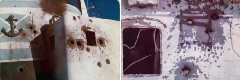 Personalmente constaté que el casco a la altura del bote nº 1 presentaba gran hundimiento de chapa en forma redonda con la pintura ennegrecida, evidentemente debido a la explosión de las bombas arrojadas por los aviones y que felizmente no hicieron impacto directo.
