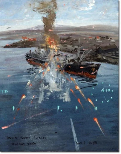 Este primer ataque fue de corta duración. Cuando se alejó el ruido de turbinas, también calló la artillería. La vida a bordo volvió a la normalidad, cada uno de nosotros trataba de contarle a su compañero su versión de lo vivido. Con gran satisfacción noté que nadie había descontrolado sus nervios y que la moral estaba tan intacta como al principio. Para aguardar los próximos acontecimientos pensé en nada mejor que hacer servir por adelantado un suculento desayuno “continental”, que levantó la moral aún más.