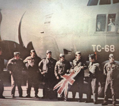 | C-130 Hércules TC-68 con su tripulación exhibiendo una bandera británica capturada en Malvinas. |