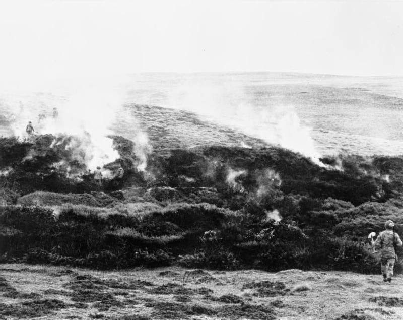 Los cuerpos yacían en filas, en la parte inferior de la colina, a la izquierda de la re-entrada, cerca del RAP, (Regimental Aid Post). Me arrastré de nuevo en el tojo quemado. Sólo para tratar de mantener el calor. El humo y el olor, que se filtraba en tu ropa, y en el ser total, en tu cuerpo, se quedaría con nosotros para siempre. Nos sentamos en pequeños grupos,